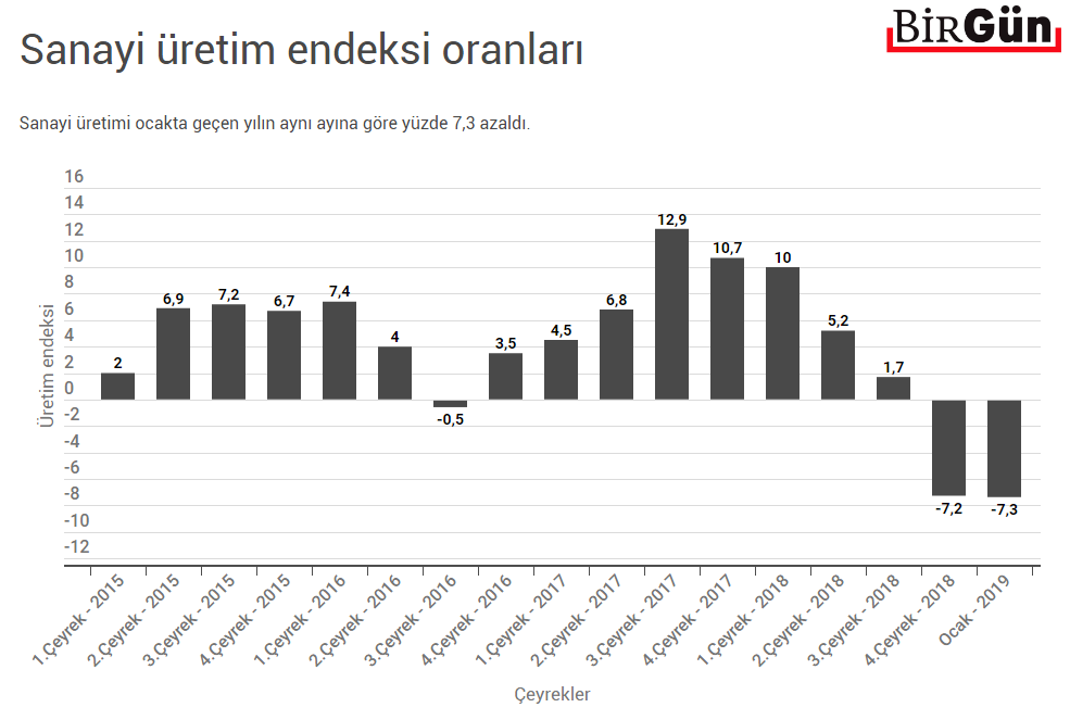 (TÜİK) açıkladığı verilere göre, takvim etkisinden arındırılmış sanayi üretimi, ocak ayında, geçen yılın aynı ayına göre yüzde 7,3 azaldı. Mevsim ve takvim etkisinden arındırılmış sanayi üretimi ise bir önceki aya göre yüzde 1 yükseldi.(BİRGÜN)
