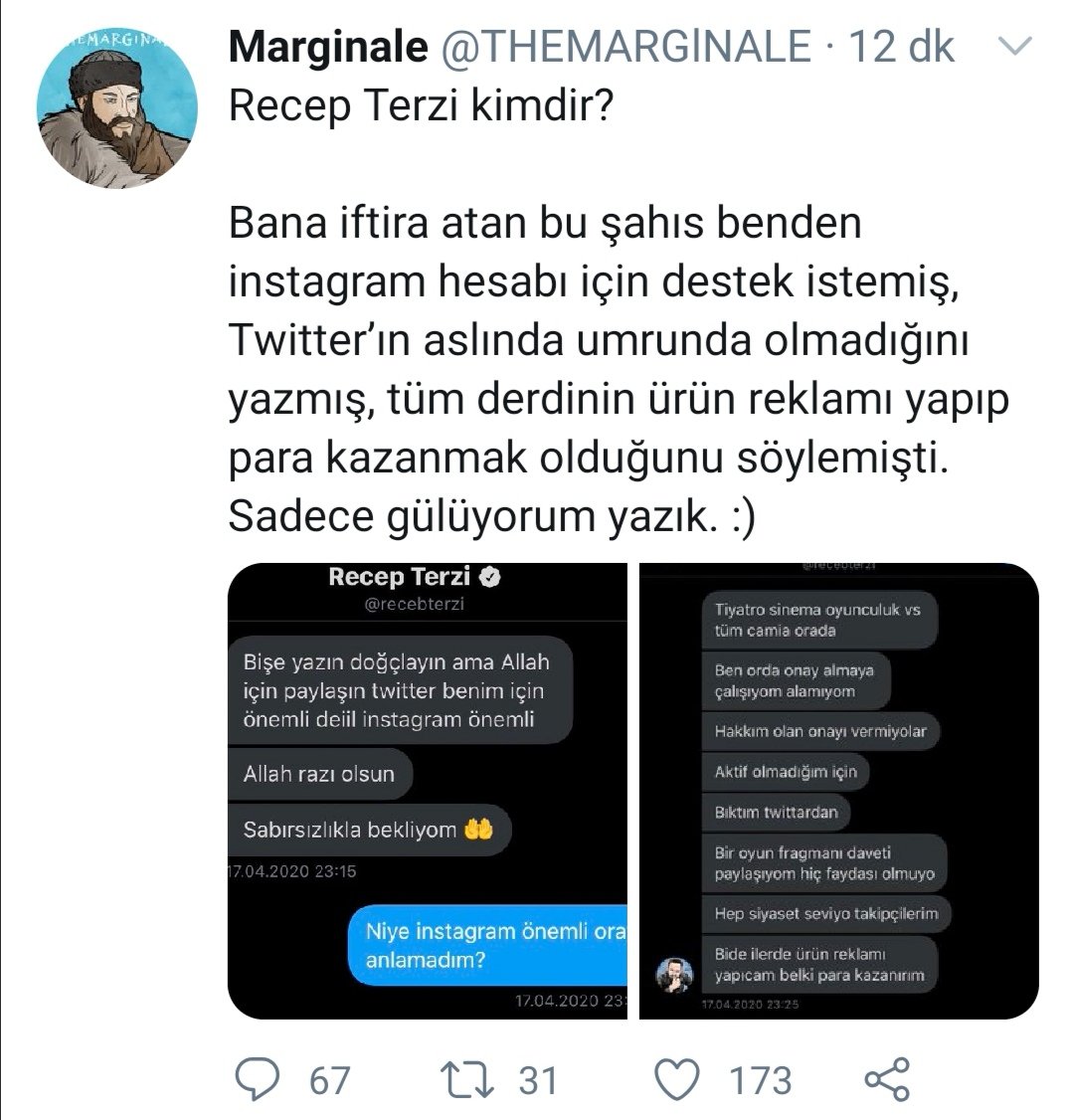 Recep Terzi ve ‘Marginale’ kullanıcı adlı AKP’li troller sosyal medyada birbirine girdi. Marginale, “Recep Terzi kimdir?” başlıklı bir tweet yayınlayarak Terzi’nin mesajlarını ifşa etti ve para için kendisinden reklam istediğini, ‘dava derdi gütmediğini’ savundu.(1)